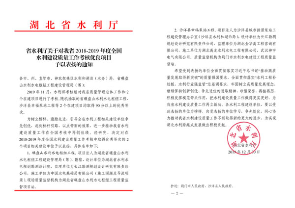 熱烈祝賀神宇電氣承接的沙洋縣幸福泵站項目被評為“2018-2019年度全國水利建設質(zhì)量工作考核優(yōu)良項目”