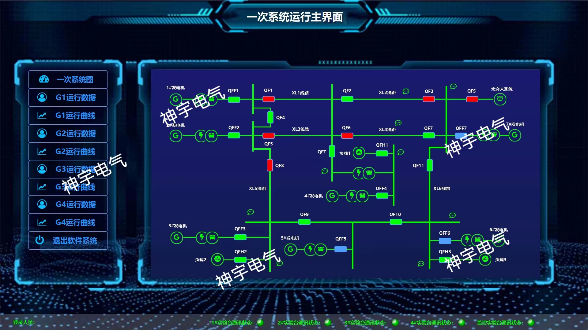 1.2整個(gè)監控一次系統可構成一個(gè)可變的多機環(huán)型電力網(wǎng)絡(luò ),便于進(jìn)行理論計算和實(shí)驗分析;每條輸電線(xiàn)路和負荷都配有微機型標準電力監測儀,可以顯示各支路的電流、電壓、有功功率、無(wú)功功率、功率因數共計二十幾多個(gè)電量,并且都通過(guò)RS-485通訊口與上微機相聯(lián),實(shí)時(shí)顯示電力系統的運行狀況,以及各開(kāi)關(guān)的動(dòng)作情況。同步監視電力網(wǎng)絡(luò )的潮流分布和進(jìn)行多機電力系統的潮流計算及保存歷史數據,繪制歷史曲線(xiàn),具有“遙測”、“遙信”、“遙調”、“遙控”四遙等功能。